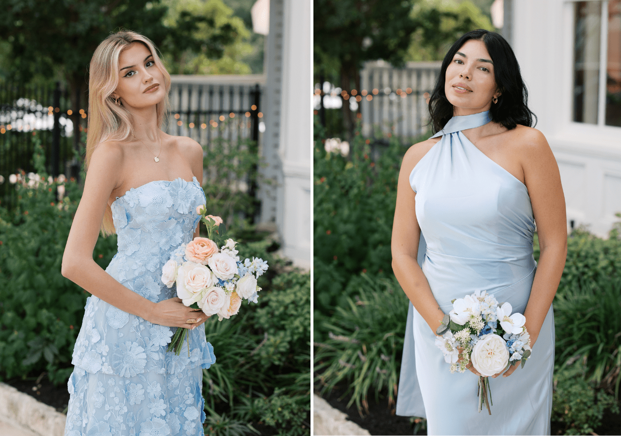 - The Taylor Collection — A timeless blend of soft lavender, periwinkle blue, and ivory, creating a cool, refined look. These elegant florals paired effortlessly with Revelry’s Imani Dress in Sky Blue Satin, balancing modern romance with sophisticated charm.