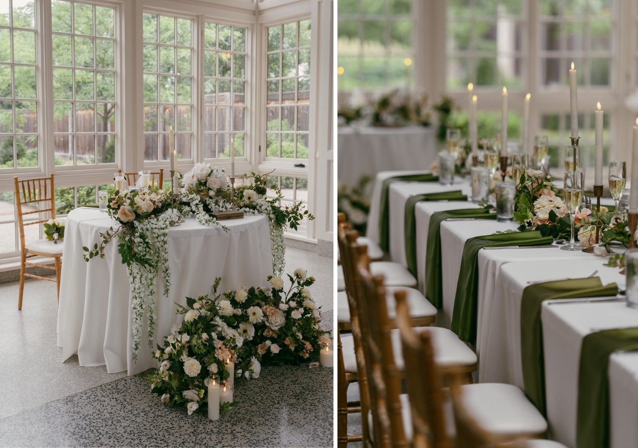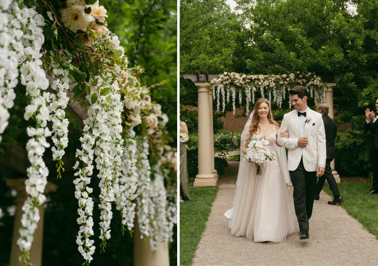 The ceremony design was effortlessly romantic, with White Wisteria Garland layered beneath Eloise Garland to create soft, cascading texture throughout the space. These wedding flowers were seamlessly repurposed for the reception, where the garlands were styled on the couple’s sweetheart table and draped along guest tables. A mix of copper and silver candlesticks added warmth and ambiance, completing the elevated spring wedding design.