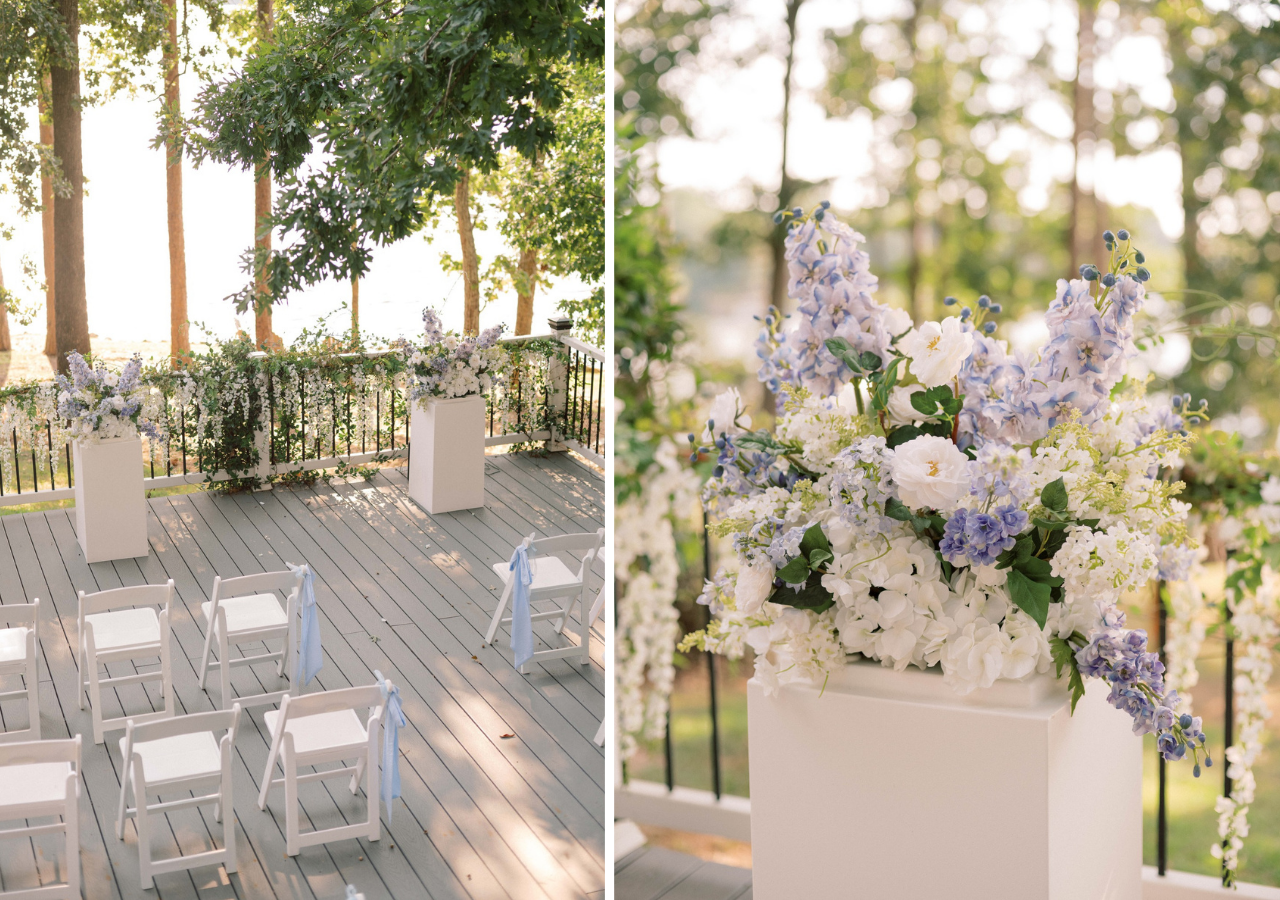 She chose the Millie Collection, known for its soft, romantic blooms and delicate hues—perfect for creating that fresh, just-picked look. To frame the ceremony space, two Millie Floral Meadows were placed atop white pillars, while White Wisteria Garland was draped along the back railing, adding light, cascading texture. The aisle was lined with white chairs tied with light blue ribbons, subtly pulling in the floral tones and creating a cohesive, thoughtful design.