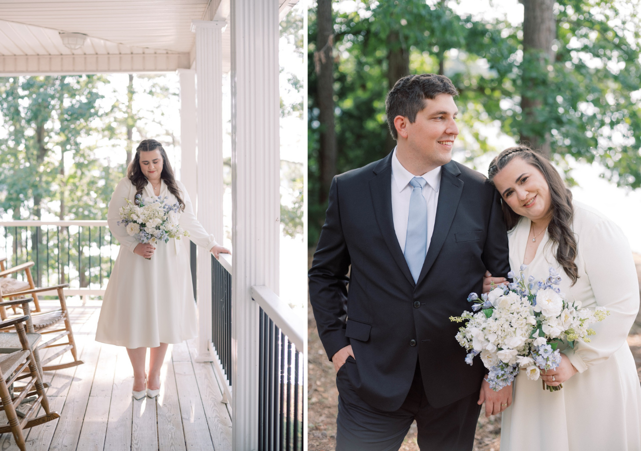 Emily’s intimate wedding took place on the back porch of a charming lakeside cabin, creating a serene and romantic setting surrounded by nature. With its soft color palette and airy floral design, the celebration effortlessly captures the essence of spring.