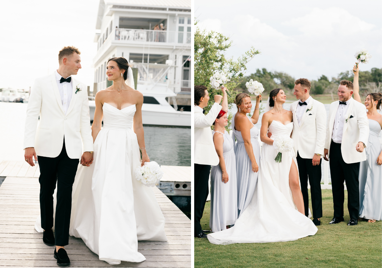 Her bridesmaids wore soft ice-blue dresses, adding a subtle touch of color, while the groom and his groomsmen wore white jackets with black pants and bow ties, accented with Audrey Boutonnieres. The overall aesthetic was fresh, timeless, and beautifully cohesive.