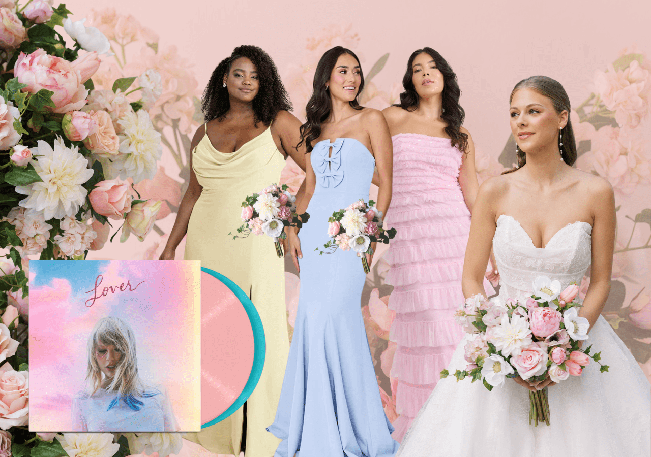 For styling, draw inspiration from the Lover album cover: pale yellow, blush pink, and soft blue bridesmaid dresses bring out the collection’s gentle charm. Whether your wedding is a black-tie affair or an intimate garden celebration, Charlotte’s floral elegance captures the era’s joy and femininity.