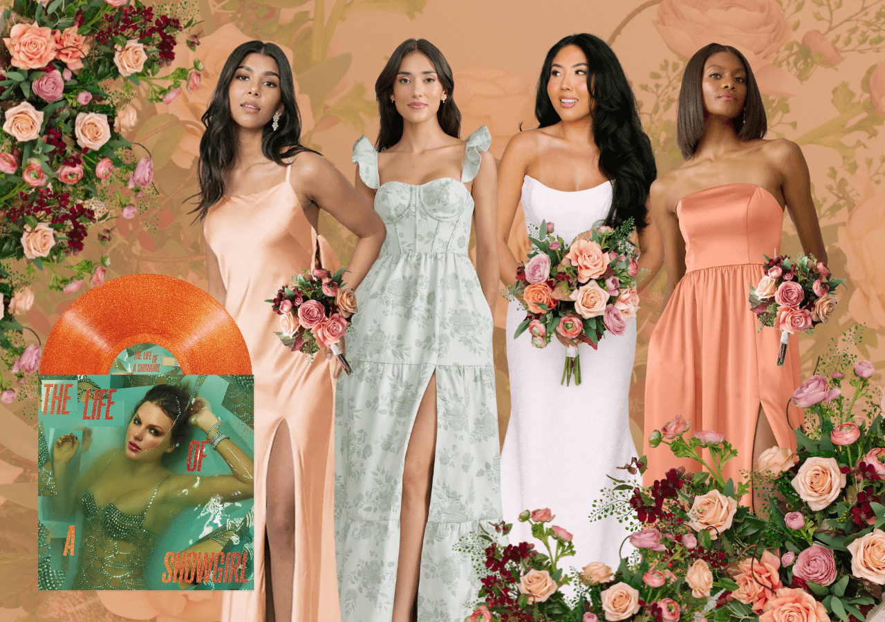 To highlight this dreamy palette, we love pairing Nina with bridesmaid dresses in shades of peach, sage, and tangerine. These warm, vibrant tones bring out the collection’s depth while creating a fresh, modern aesthetic that feels perfectly in step with Taylor’s newest era. Whether you’re leaning into bold color or layering softer hues, Nina ensures your wedding blooms are as unforgettable as the moment you say “I do.”