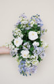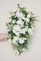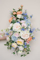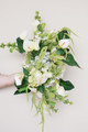 The Eloise floral swag is designed to perfectly coordinate with our Eloise Collection. This floral swag features gorgeous garden roses in shades of linen cream paired with zinnias, light peach ranunculus, and dahlias. Two-toned blush trailing roses add a subtle hint of color, while an abundance of wild wisteria makes for an organic style. Premium silk florals.