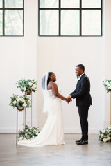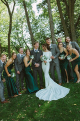 Eucalyptus, thistle, and Queen Anne’s lace add depth and interest to every design. These layered greens create a contemporary, garden-forward feel that elevates the crisp white florals.