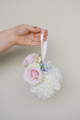 The Kate pomander ball is a white rose ball, accented with light pink tea roses, blue hydrangea, and white heptacodium. It is designed with a silk ribbon, used to be held by the flower girl's hands. Premium silk florals.