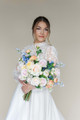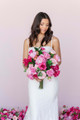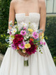 The Kinsley bridal bouquet features large fuchsia peonies, light pink butterfly ranunculus, two-toned yellow poppies, marigold bush, and playful white cosmos. The bouquet is accented with hints of Queen Anne's lace and baby blossom spray, with nandina greenery for added texture and movement. Premium silk florals.