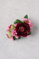 The Stella corsage features burgundy ranunculus, along with pink waxflower and hints of greenery. It is designed using an elastic band to be worn on the wrist. Premium silk florals.